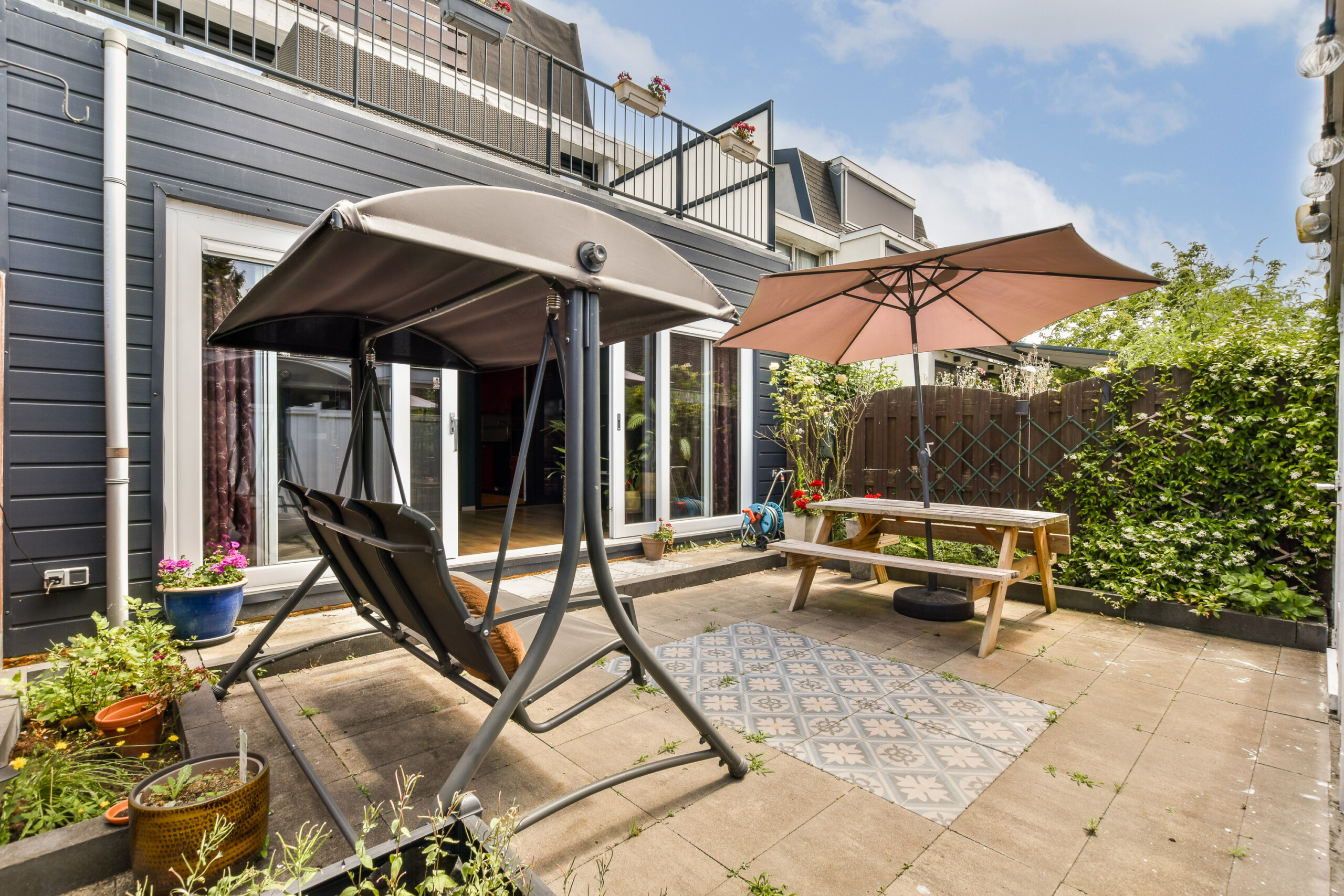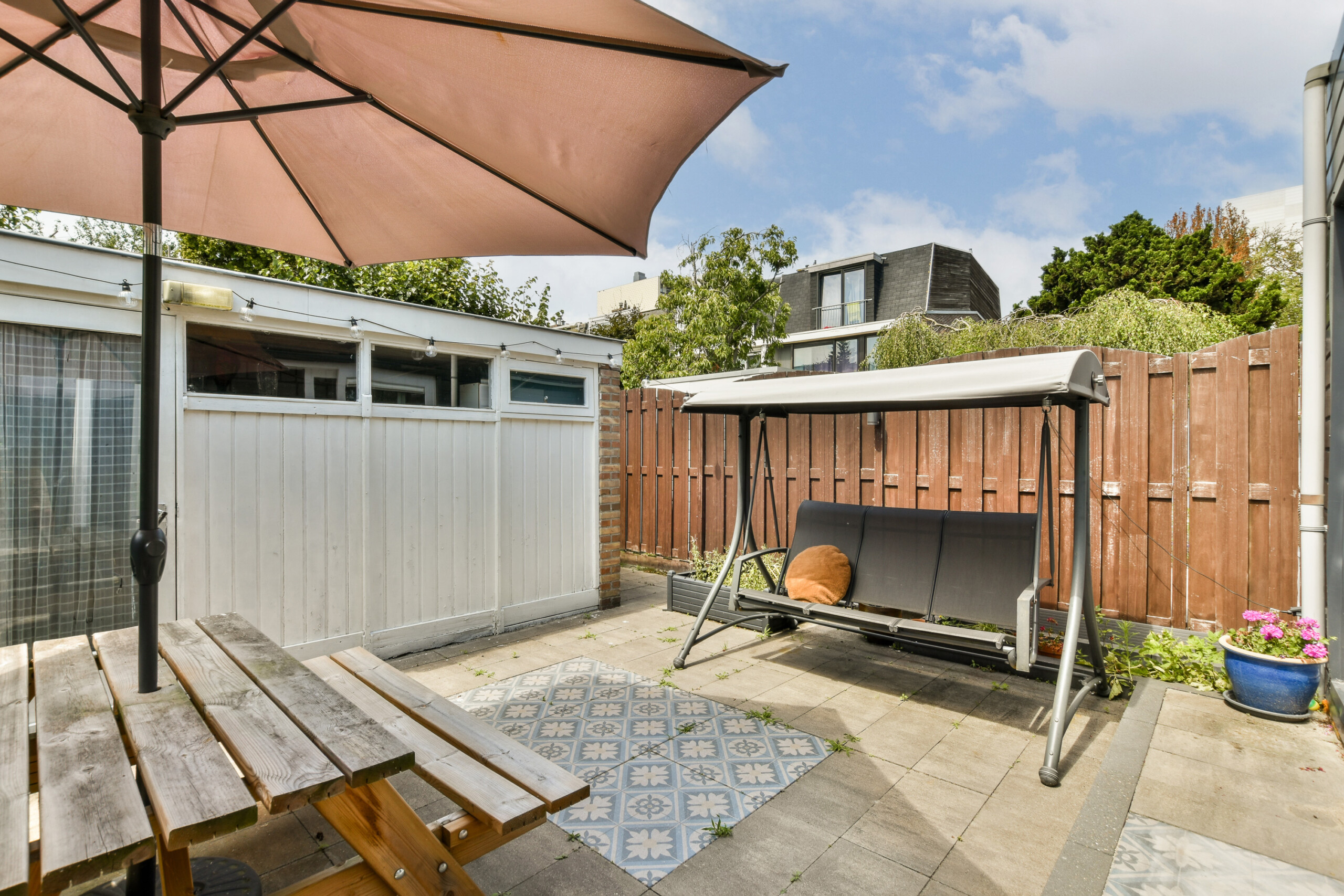 – West-facing garden with storage shed and back entrance;