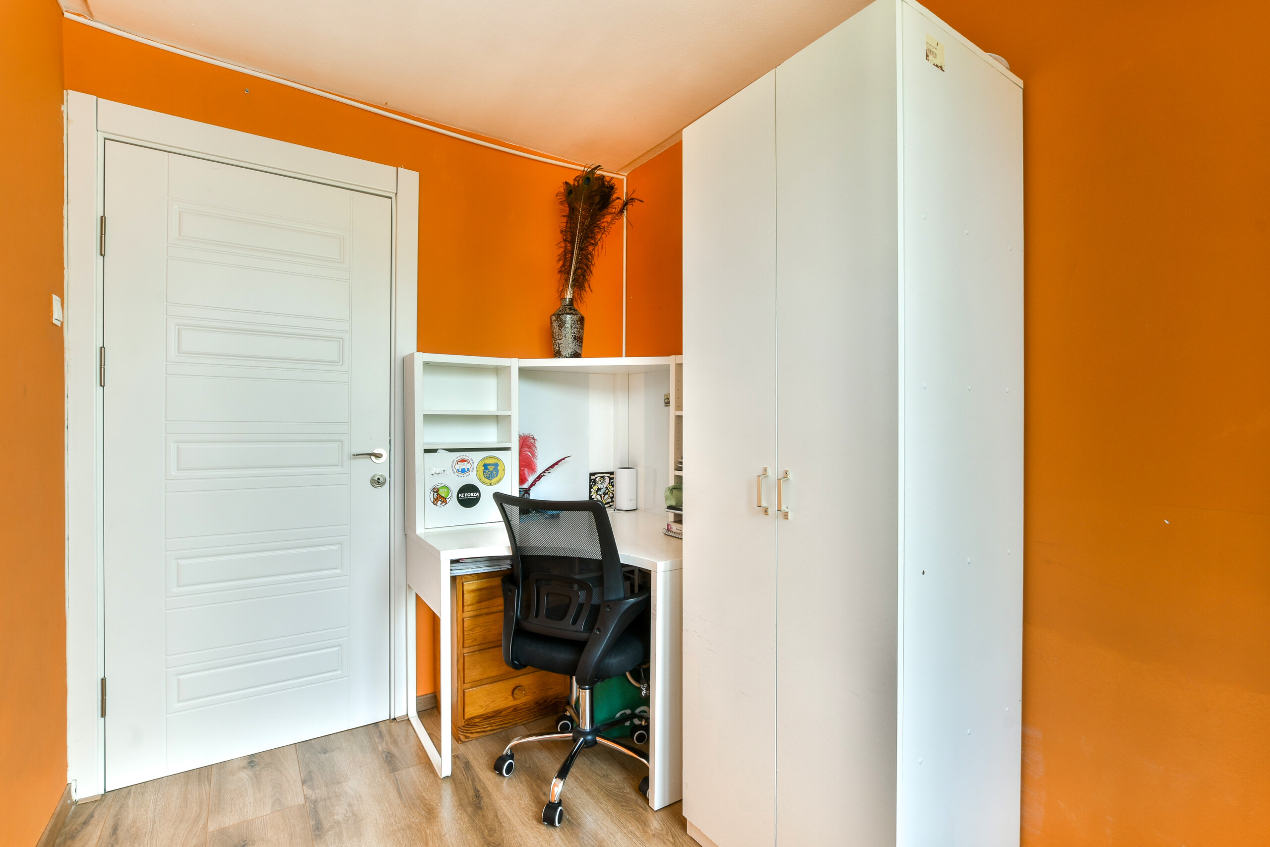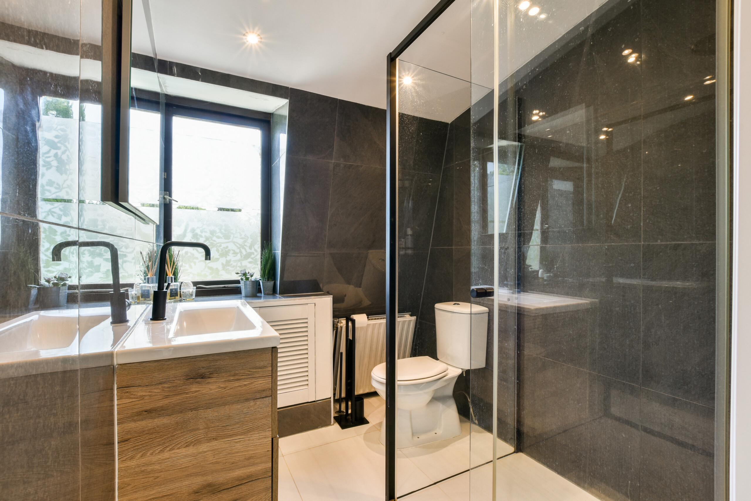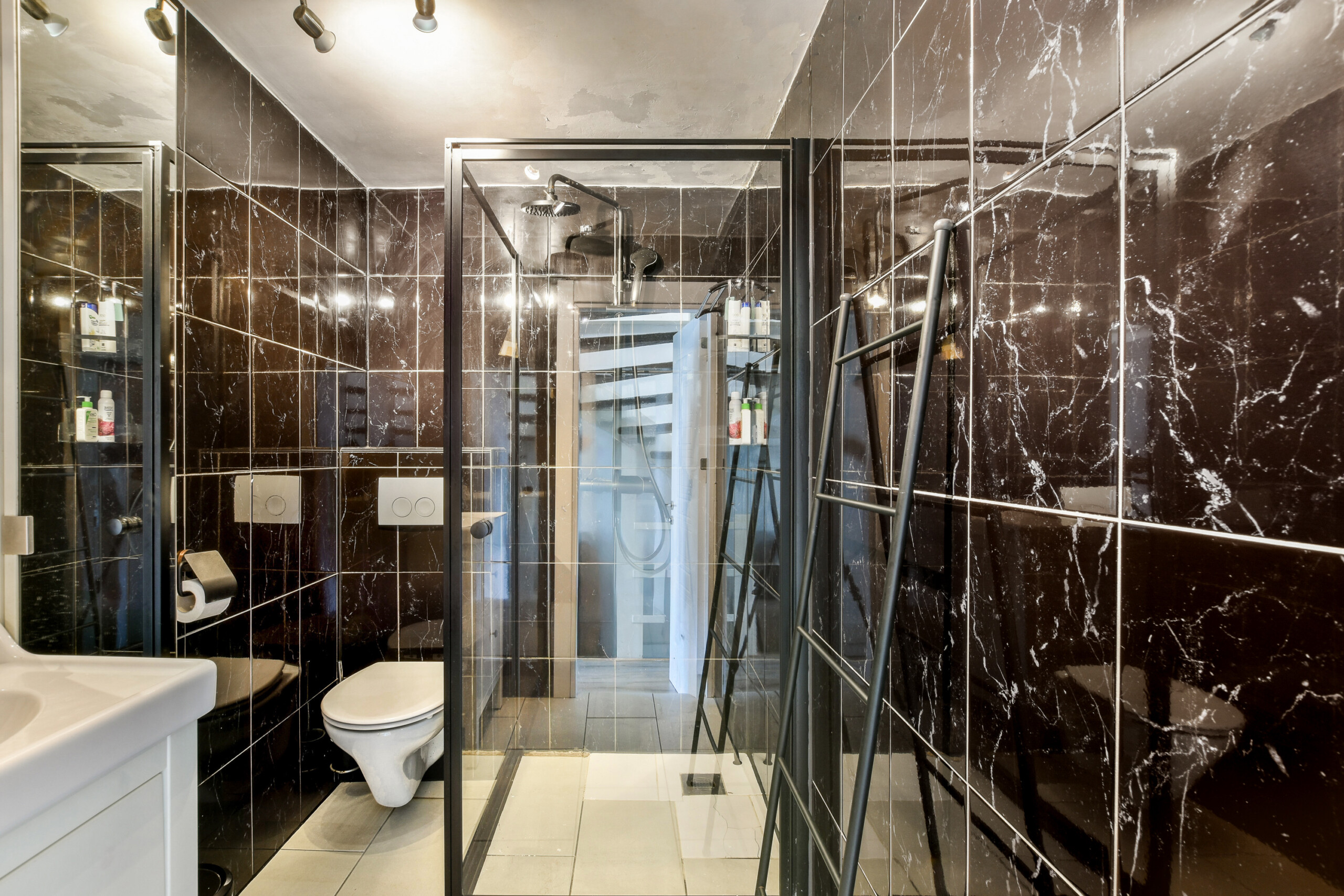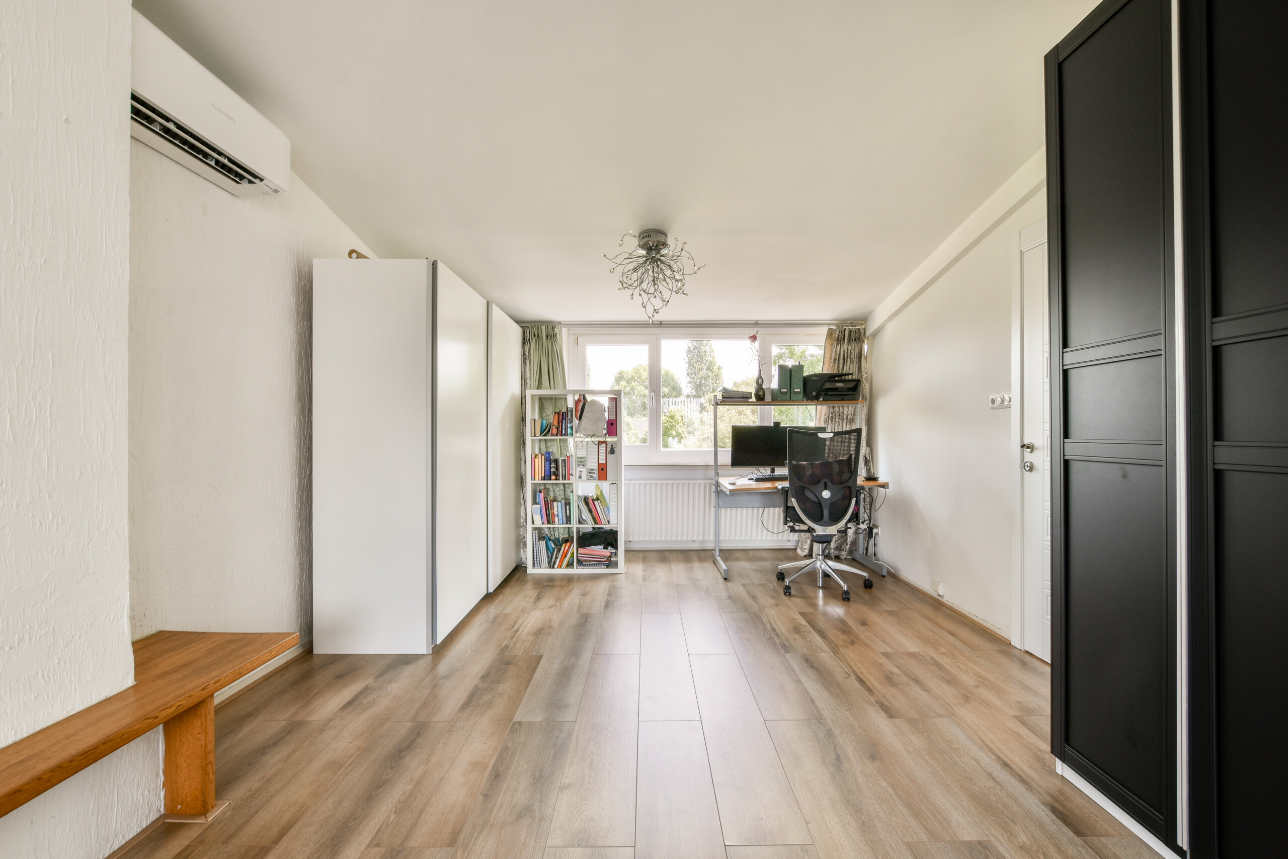 The top floor features a very spacious bedroom, currently used as both a bedroom and home office. It includes a modern private bathroom with a walk-in shower (rain and hand shower), toilet, and washbasin unit. This space could easily be divided into two separate rooms by placing a partition wall.