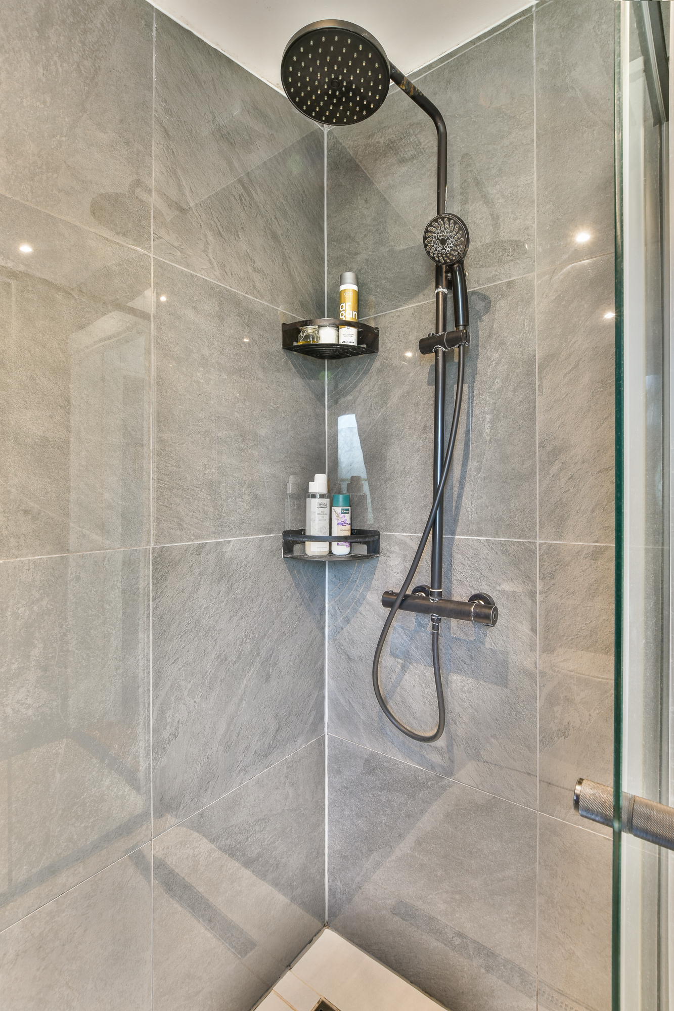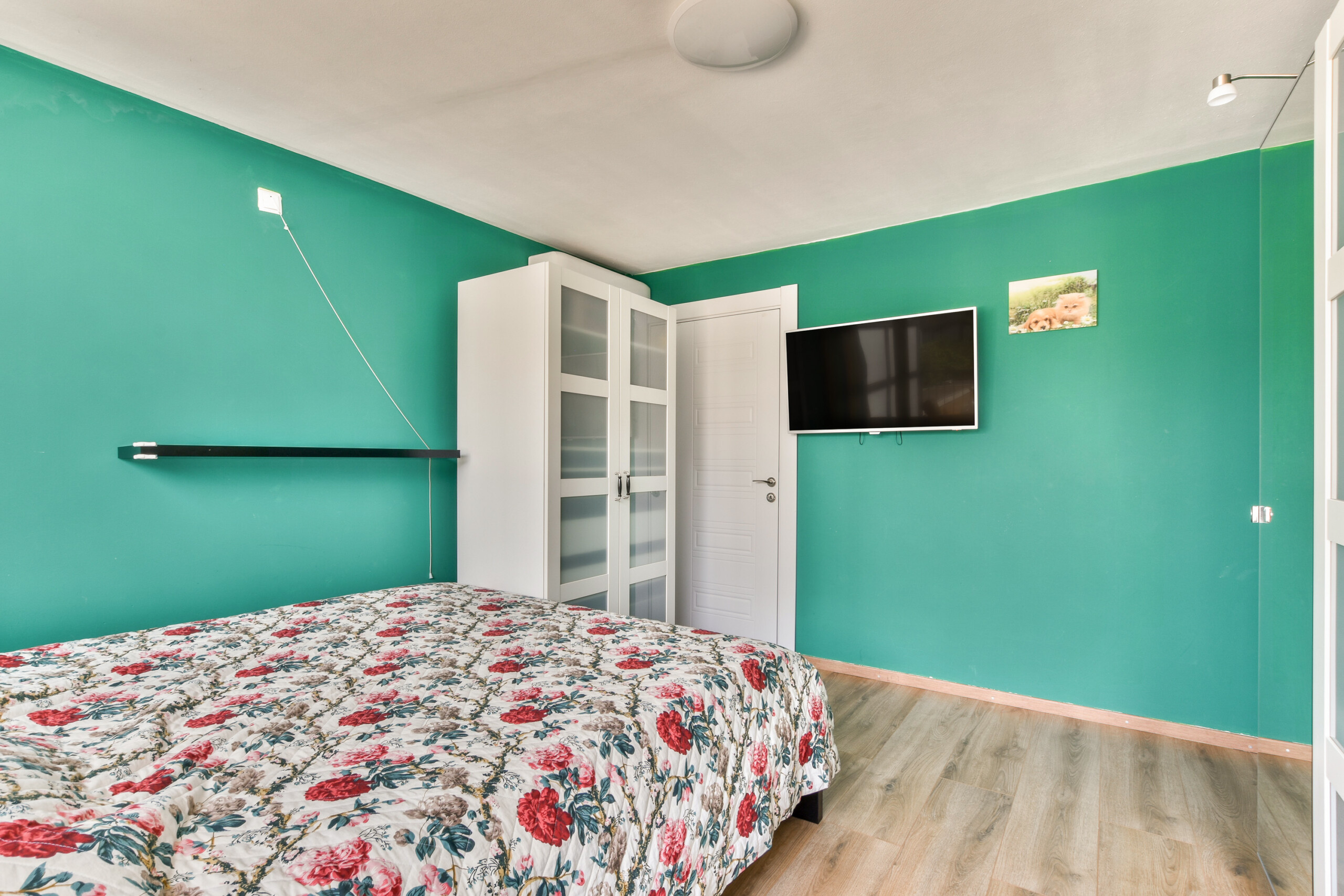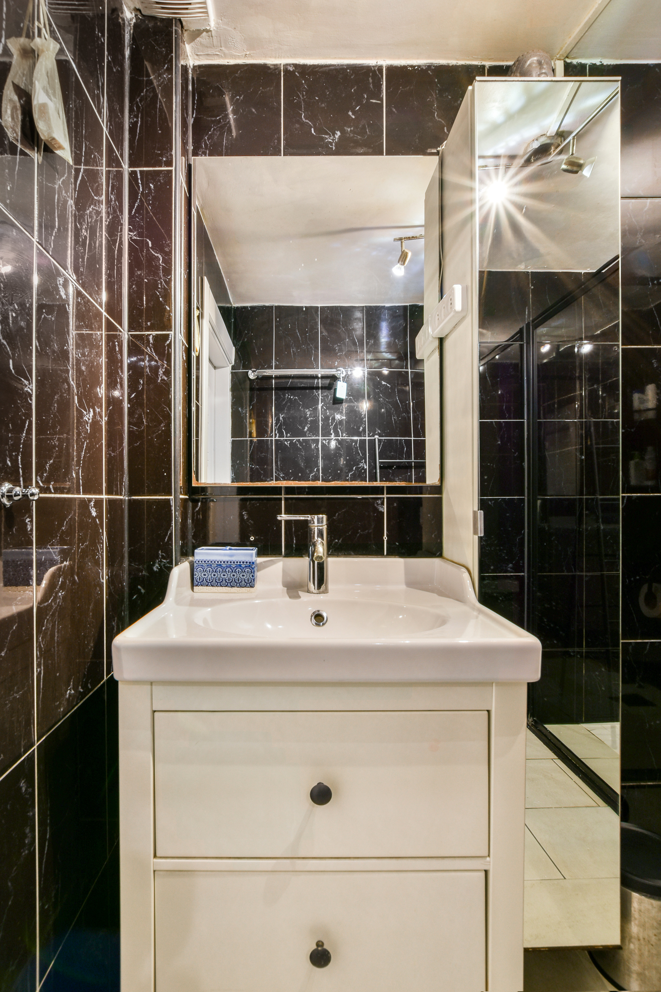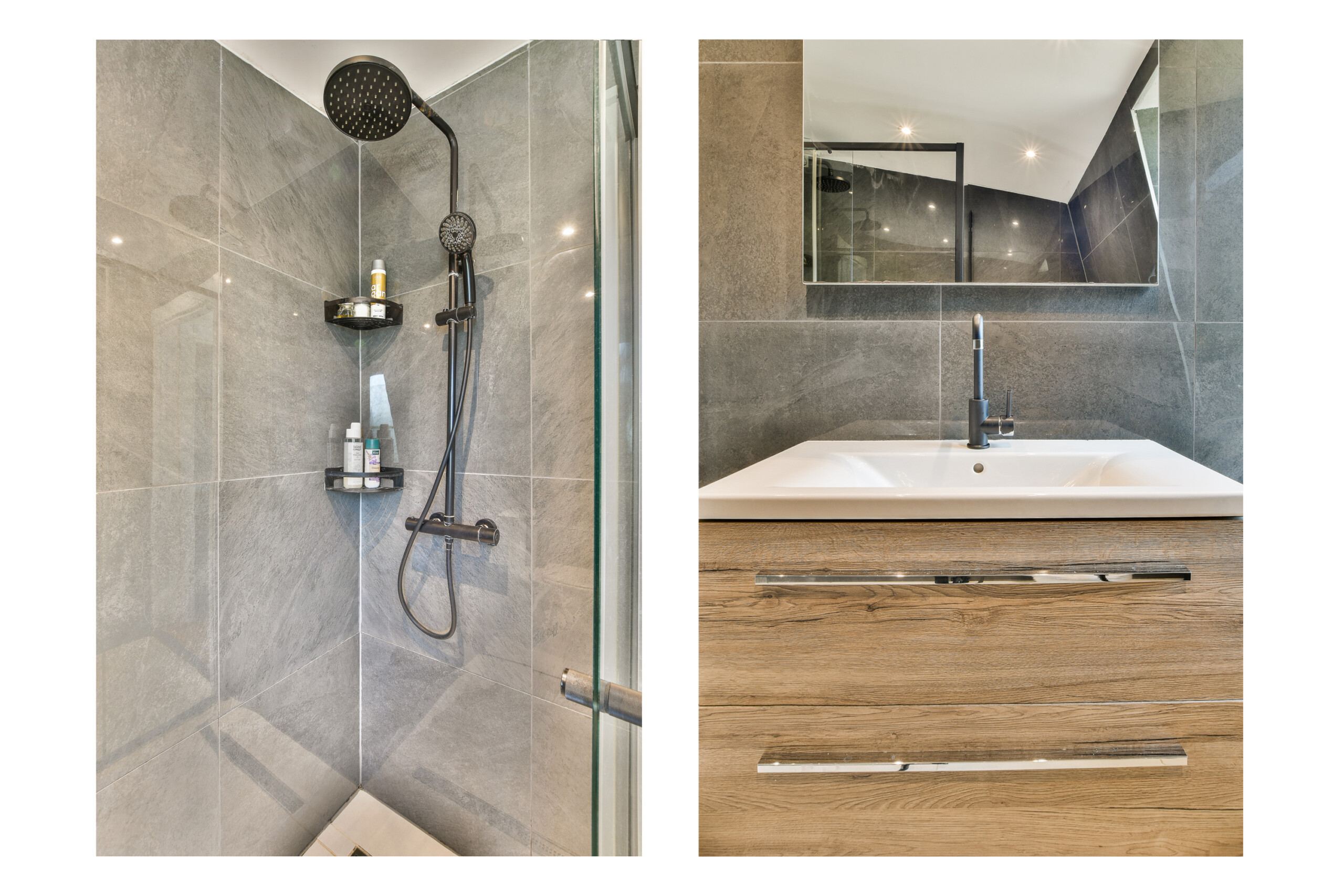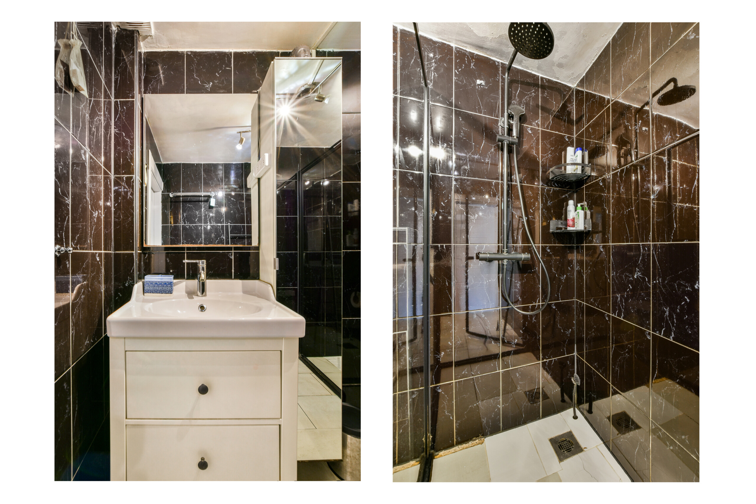 The top floor features a very spacious bedroom, currently used as both a bedroom and home office. It includes a modern private bathroom with a walk-in shower (rain and hand shower), toilet, and washbasin unit. This space could easily be divided into two separate rooms by placing a partition wall.