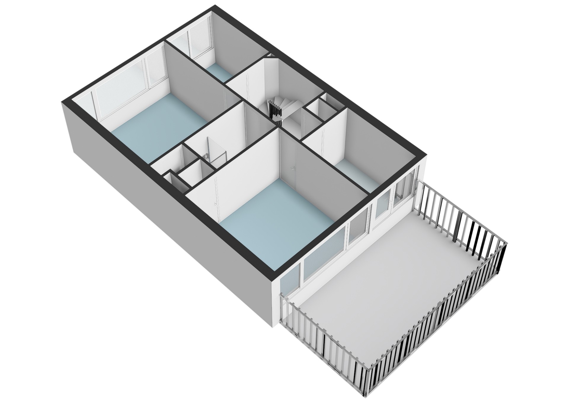The landing on the first floor provides access to four bedrooms in total – two large rooms and two of good size. The centrally located bathroom is fitted with a shower, toilet, and washbasin unit. The larger bedrooms also feature additional storage spaces, one of which houses the washing machine connection. A true highlight of this floor is the west-facing roof terrace of approx. 21 m², an ideal spot to relax and enjoy the sun.