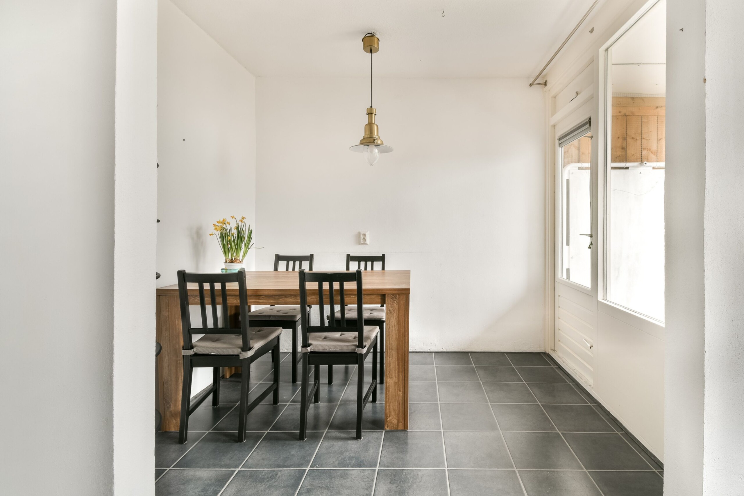 – Keuken met uitzicht op binnentuin en ruimte voor eettafel