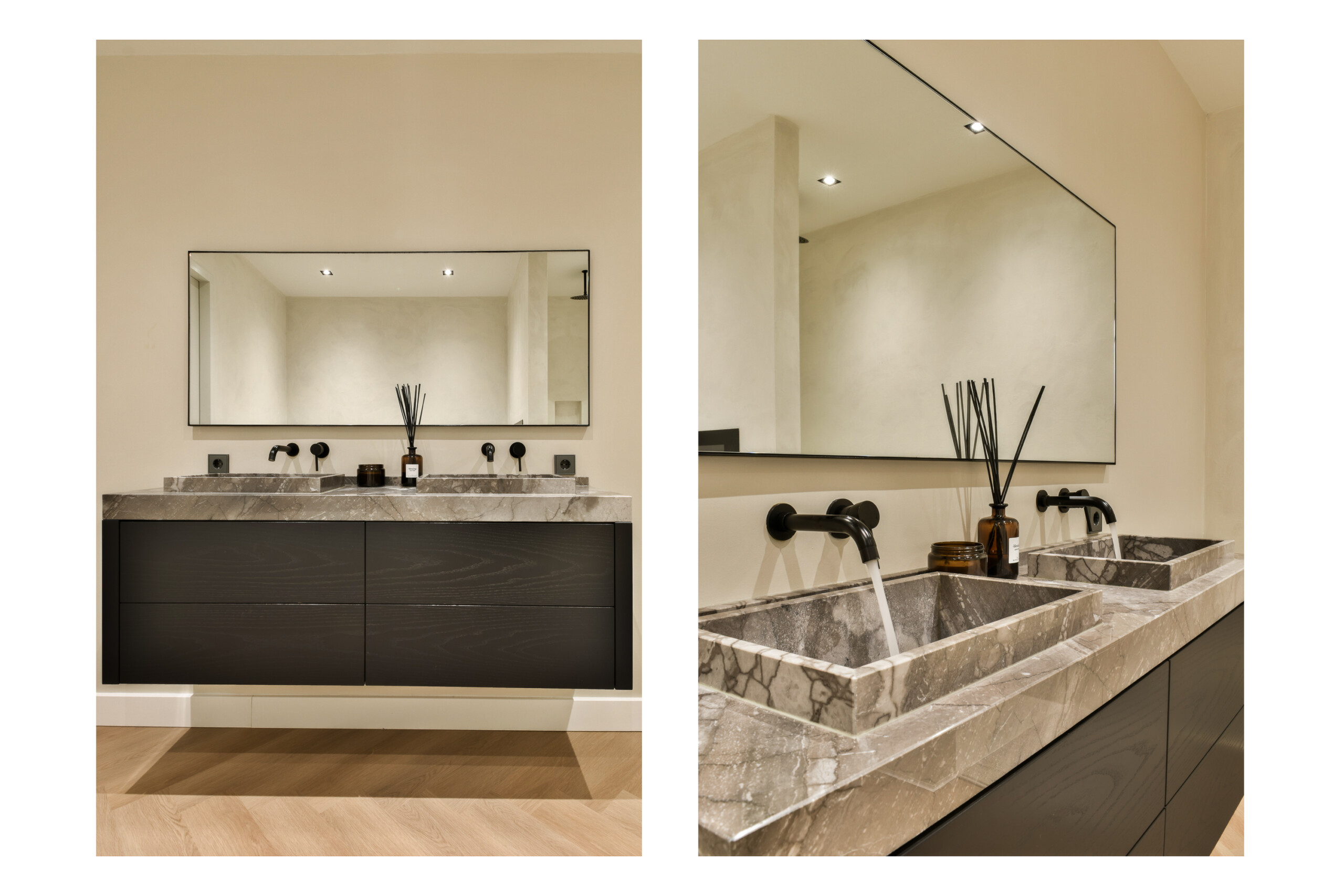 – Moderne badkamer met ligbad, dubbel op maat gemaakte wastafel meubel en inloopdouche;