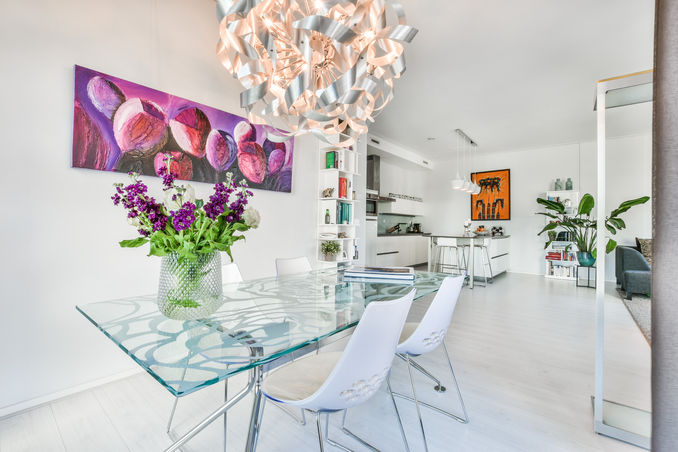 The generous living room (~50 m²) on the west and north sides is filled with natural light and offers panoramic views over the Minerva axis. Adjacent is the open-plan kitchen, which is fitted with high-end built-in appliances and appears as good as new.