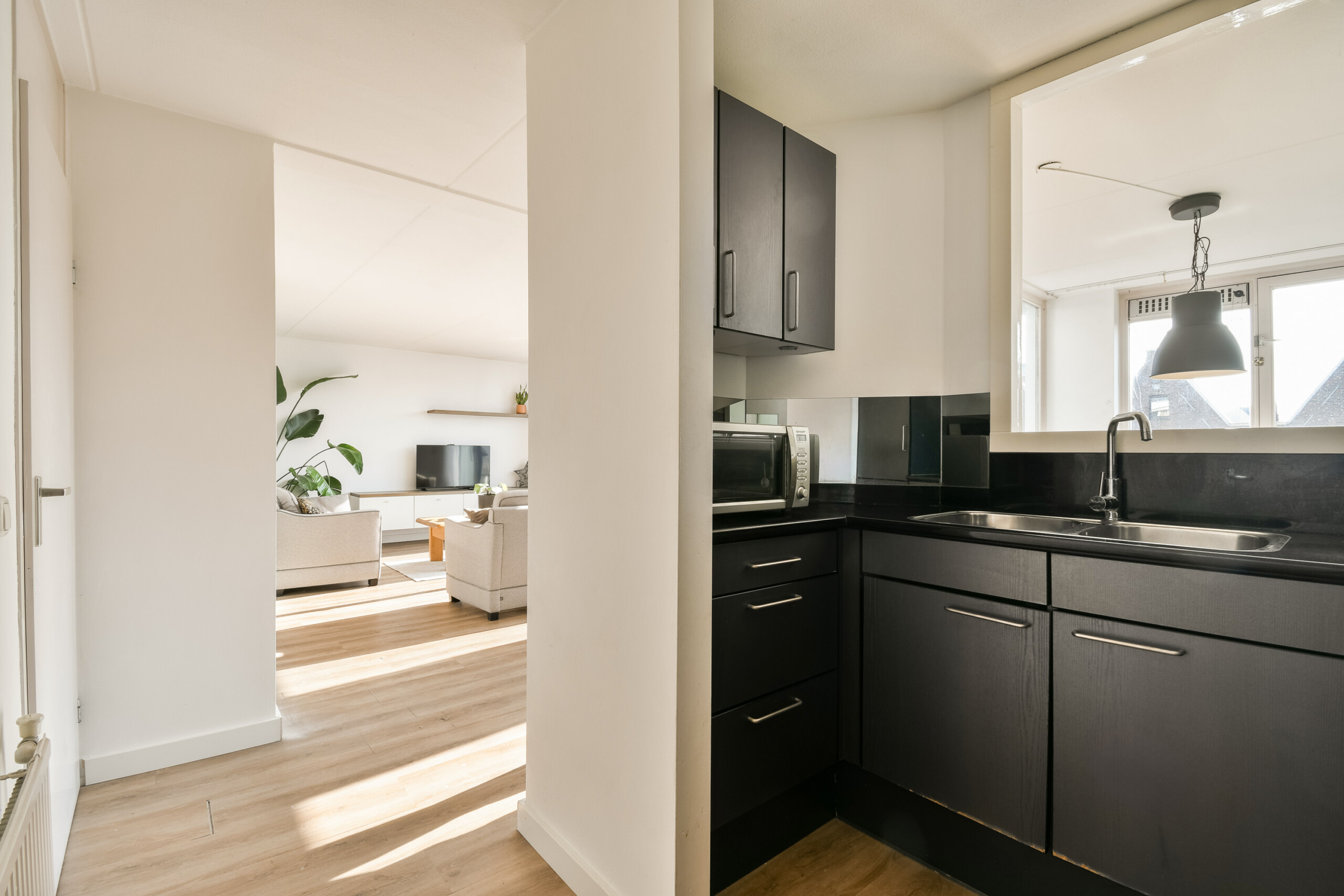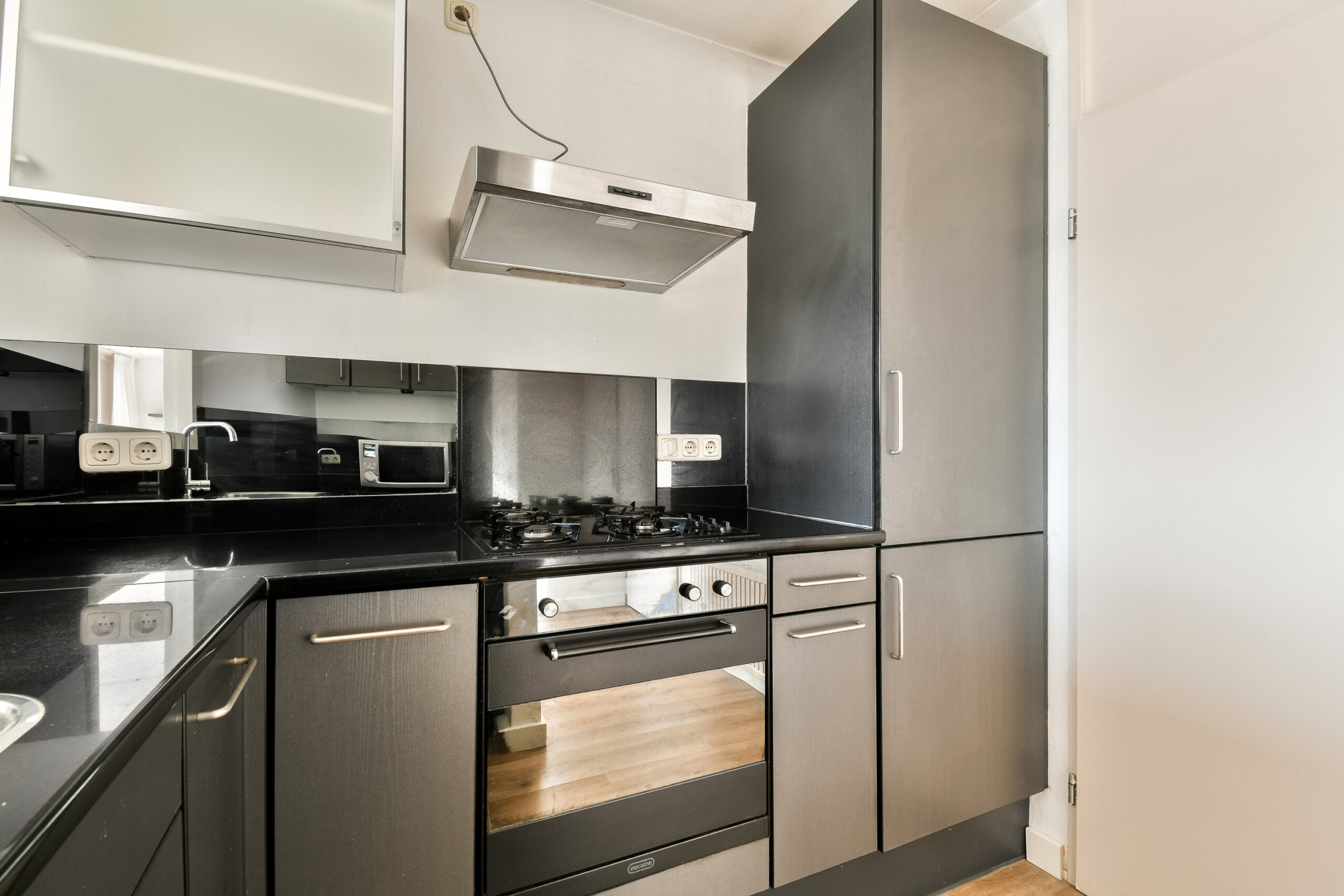 De half open keuken is modern uitgevoerd in een zwart grijze kleurstelling. In de keuken is een ruime opening gemaakt waardoor je daglicht in de keuken hebt en zicht op de eetkamer.