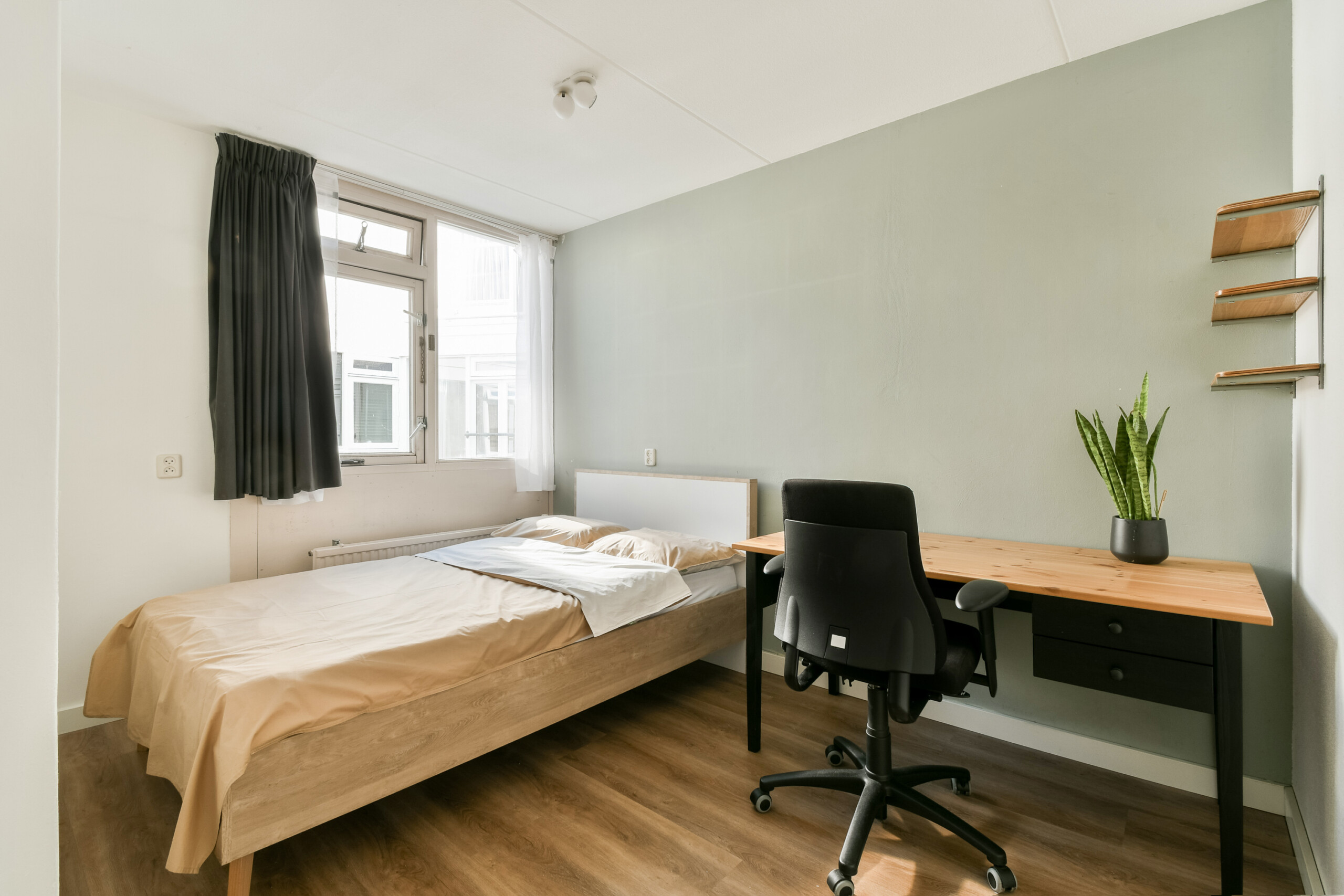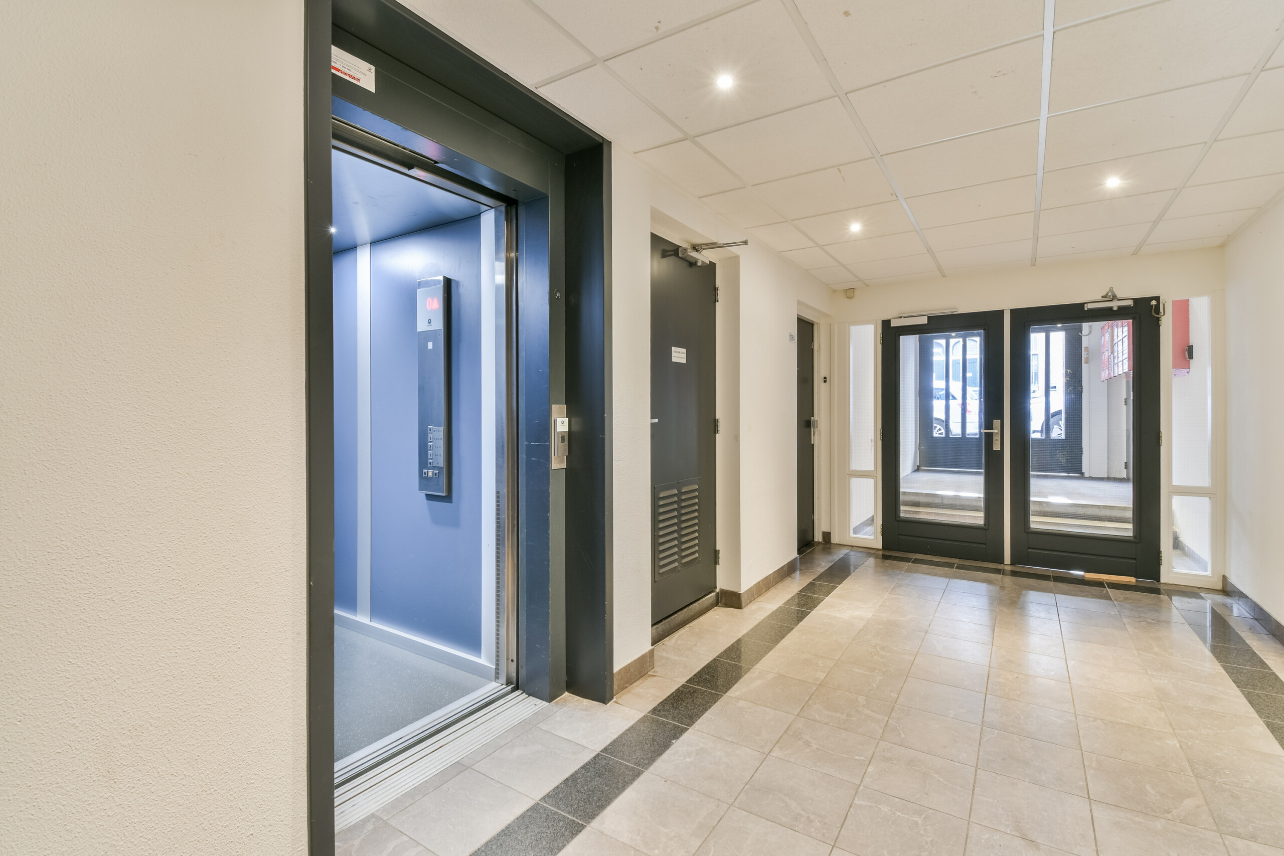 Via de lift (of de trap) kom je op de vierde verdieping. De hal biedt toegang tot de eerste slaapkamer, de badkamer, het separate toilet en de woonkamer. De ruime woonkamer met eetkamer is op het Zuid-Westen gelegen en voorzien van een laminaat vloer (deze heeft wel een beschadiging, welke op foto’s niet te zien is).