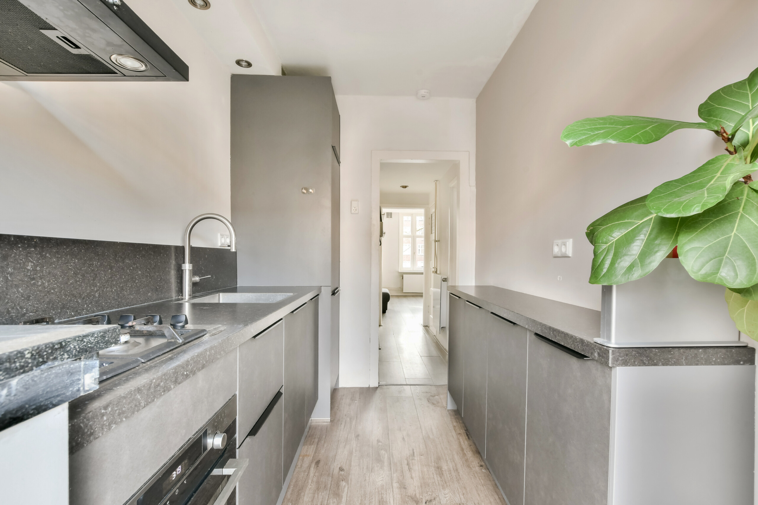 Aan de achterzijde van het appartement liggen twee ruime slaapkamers. Centraal tussen deze kamers bevindt zich de moderne keuken uit 2021, praktisch gesitueerd en met directe toegang tot het balkon.