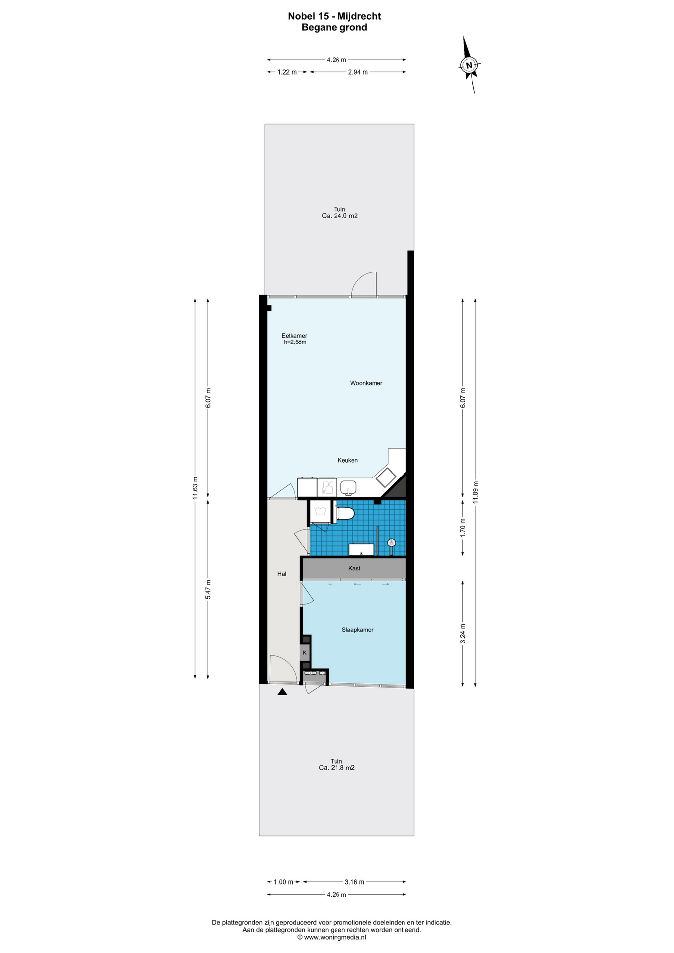 Entree, hal met toegang tot de verschillende vertrekken. Aan de voorzijde bevindt zich een ruime slaapkamer met voldoende plaats voor een grote kledingkast. De slaapkamer is eenvoudig donker te maken door middel van een elektrisch rolluik. Centraal in de woning ligt de badkamer, voorzien van douche, toilet, wastafelmeubel, vloerverwarming en aansluiting voor de wasmachine. De lichte woonkamer met open keuken bevindt zich aan de achterzijde en biedt directe toegang tot de tuin. De keuken is uitgerust met diverse inbouwapparatuur.