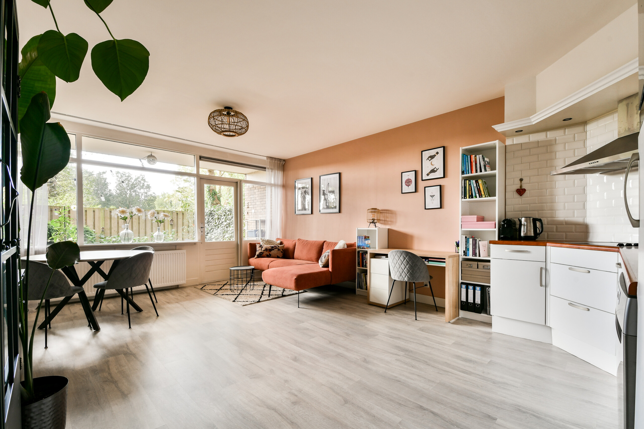 Bright and practically laid-out 1-bedroom corner apartment of approx. 50m², located on the ground floor and featuring both a sunny backyard and a sheltered front garden. The apartment offers a cozy living room with open kitchen, a spacious bedroom, and a modern bathroom. Thanks to the large windows, there is plenty of natural light and a pleasant living atmosphere. Perfect location with parking right in front, a local supermarket around the corner, and the town center within walking distance!